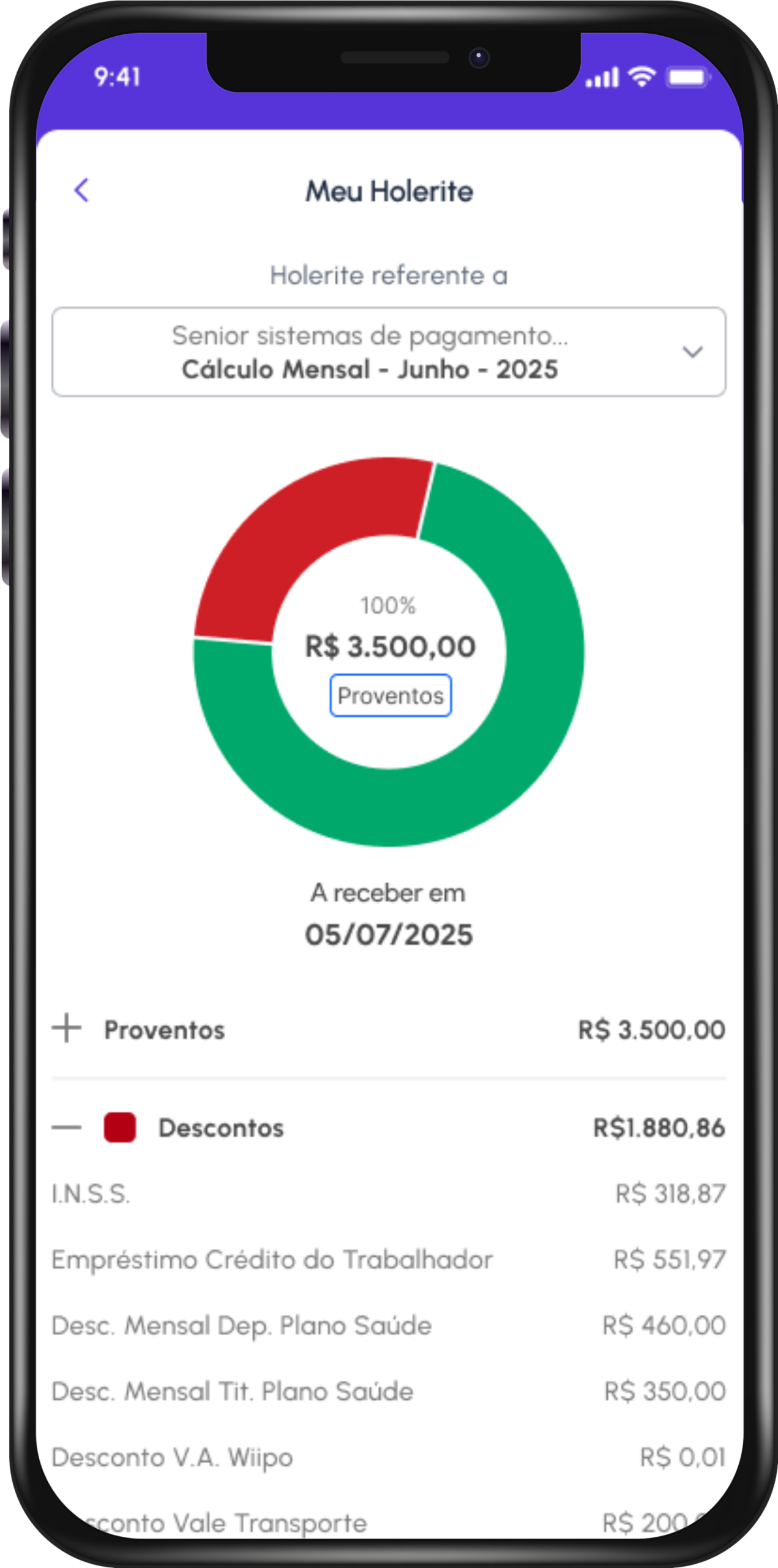 No Holerite Digital Wiipo, essas informações ficam organizadas, acessíveis e disponíveis sempre que você precisar — direto no app.